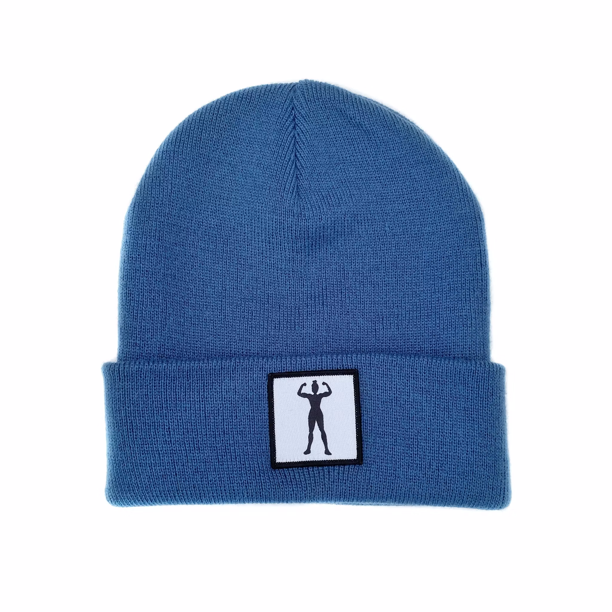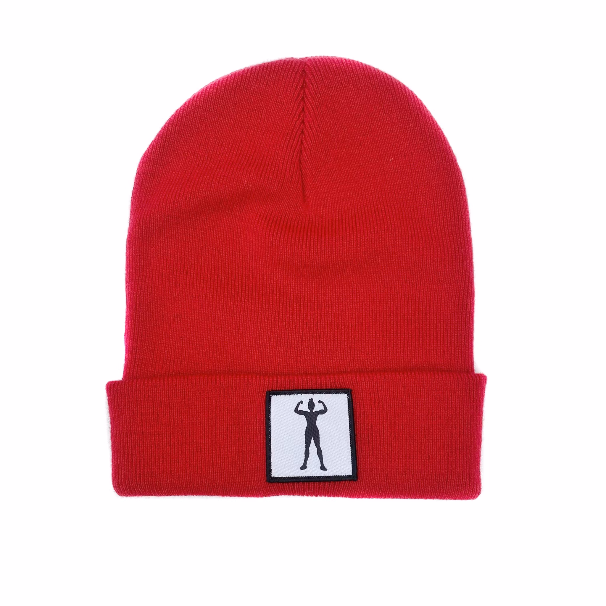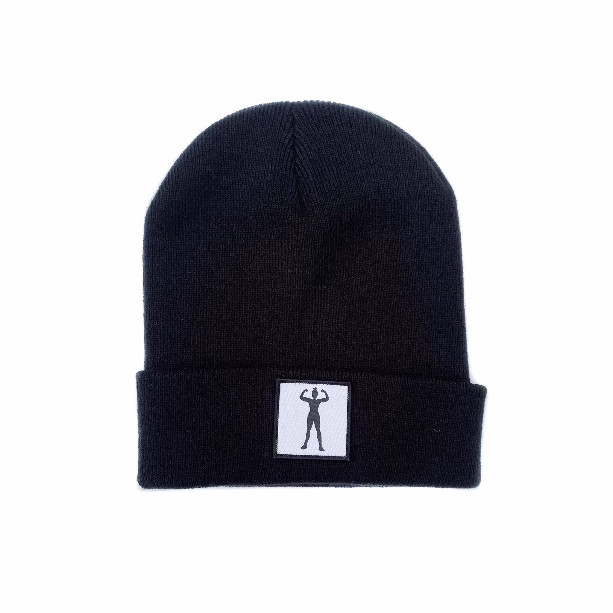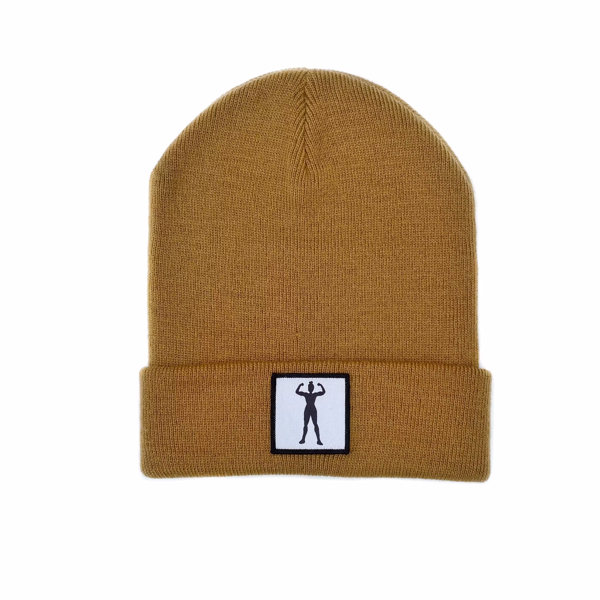 Stickad uppvikt beanie, påsytt märke med siluett av stark kvinna.