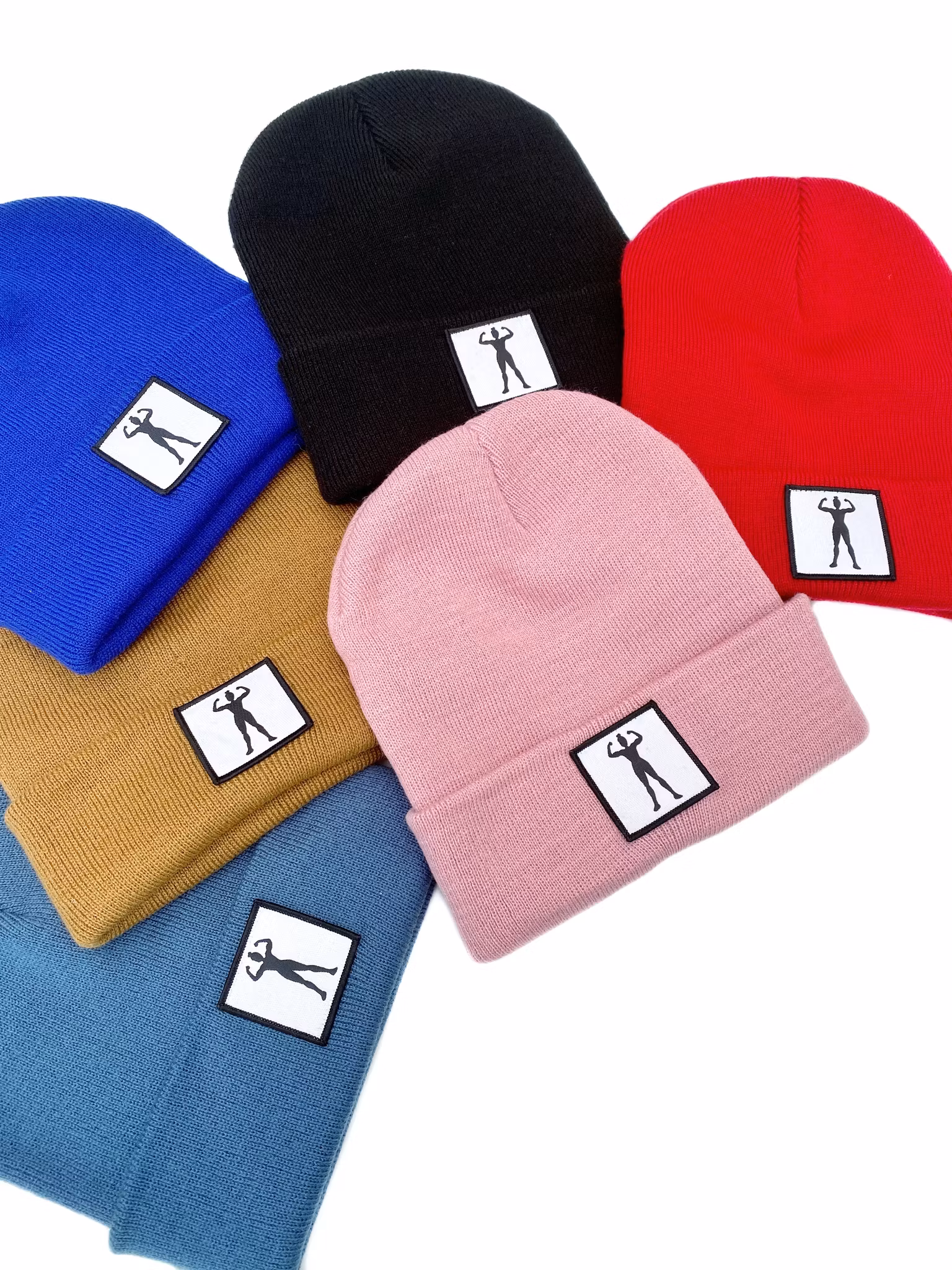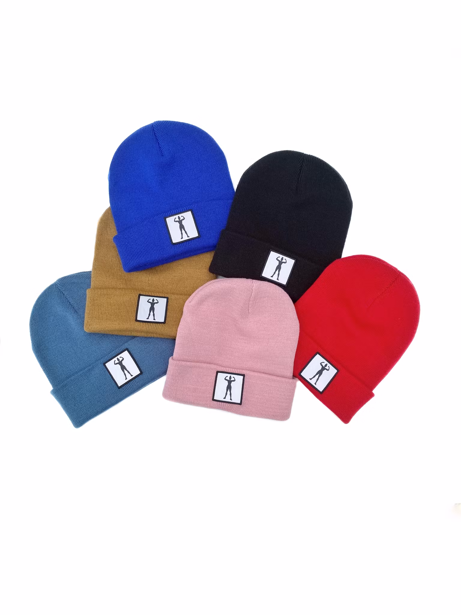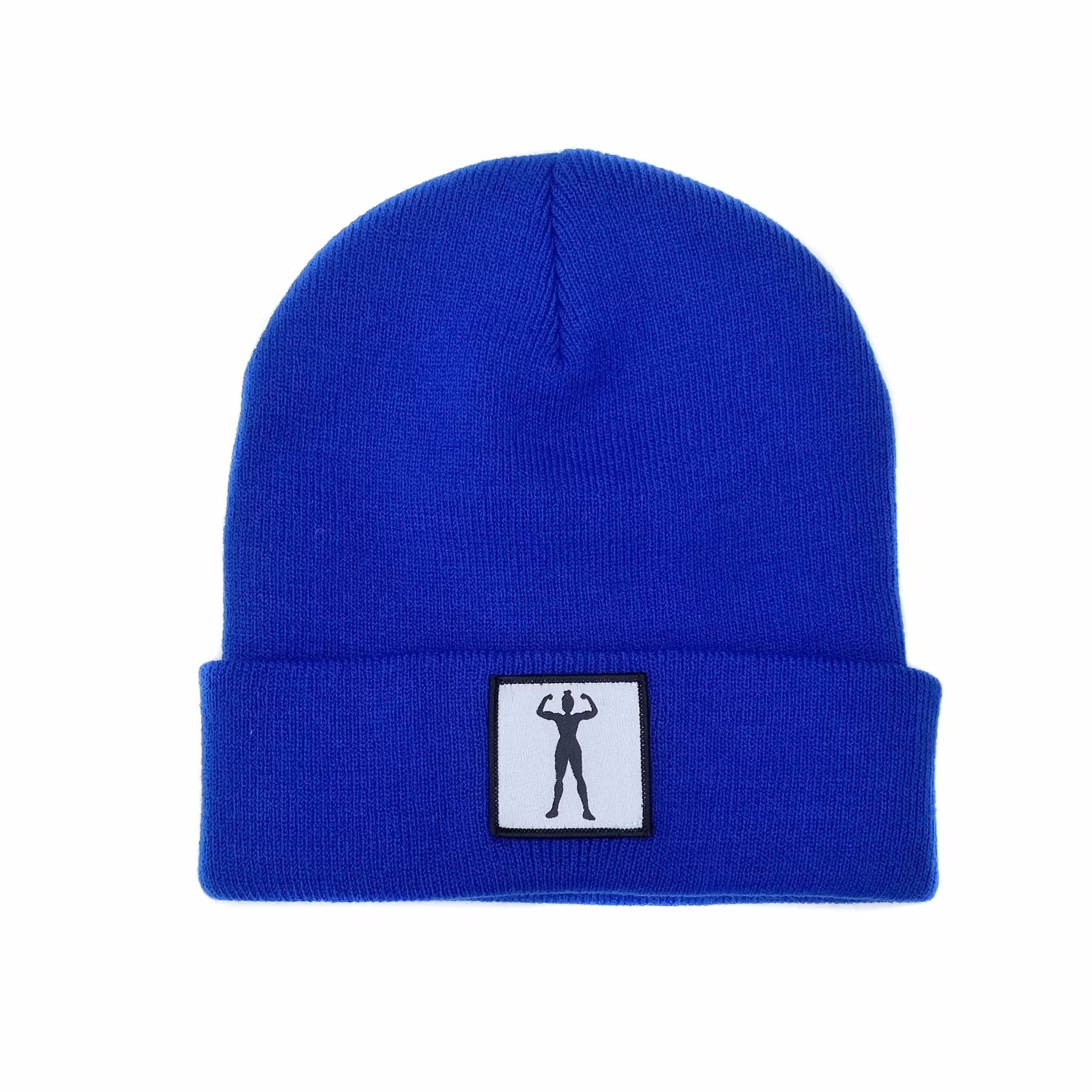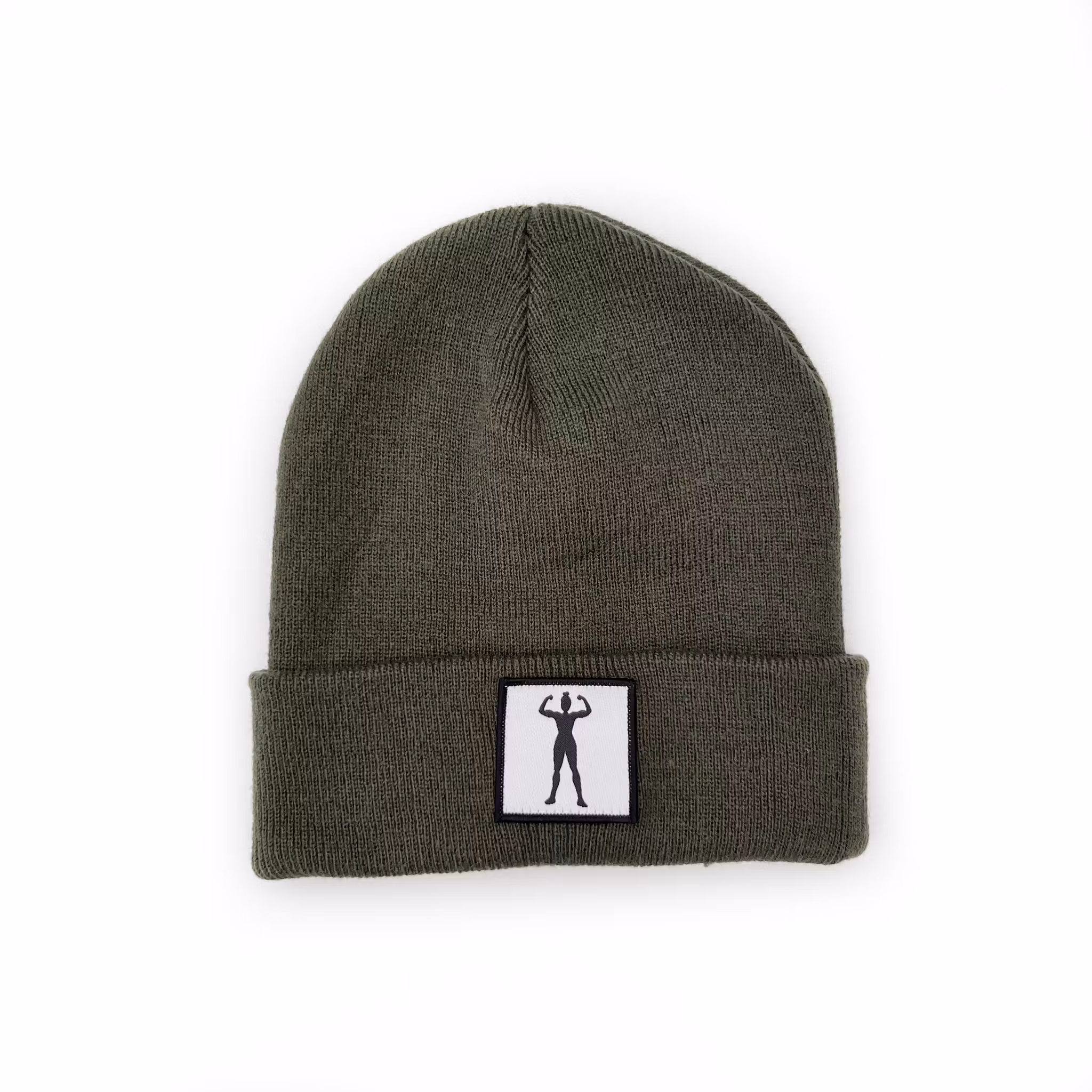 Stickad uppvikt beanie, påsytt märke med siluett av stark kvinna.