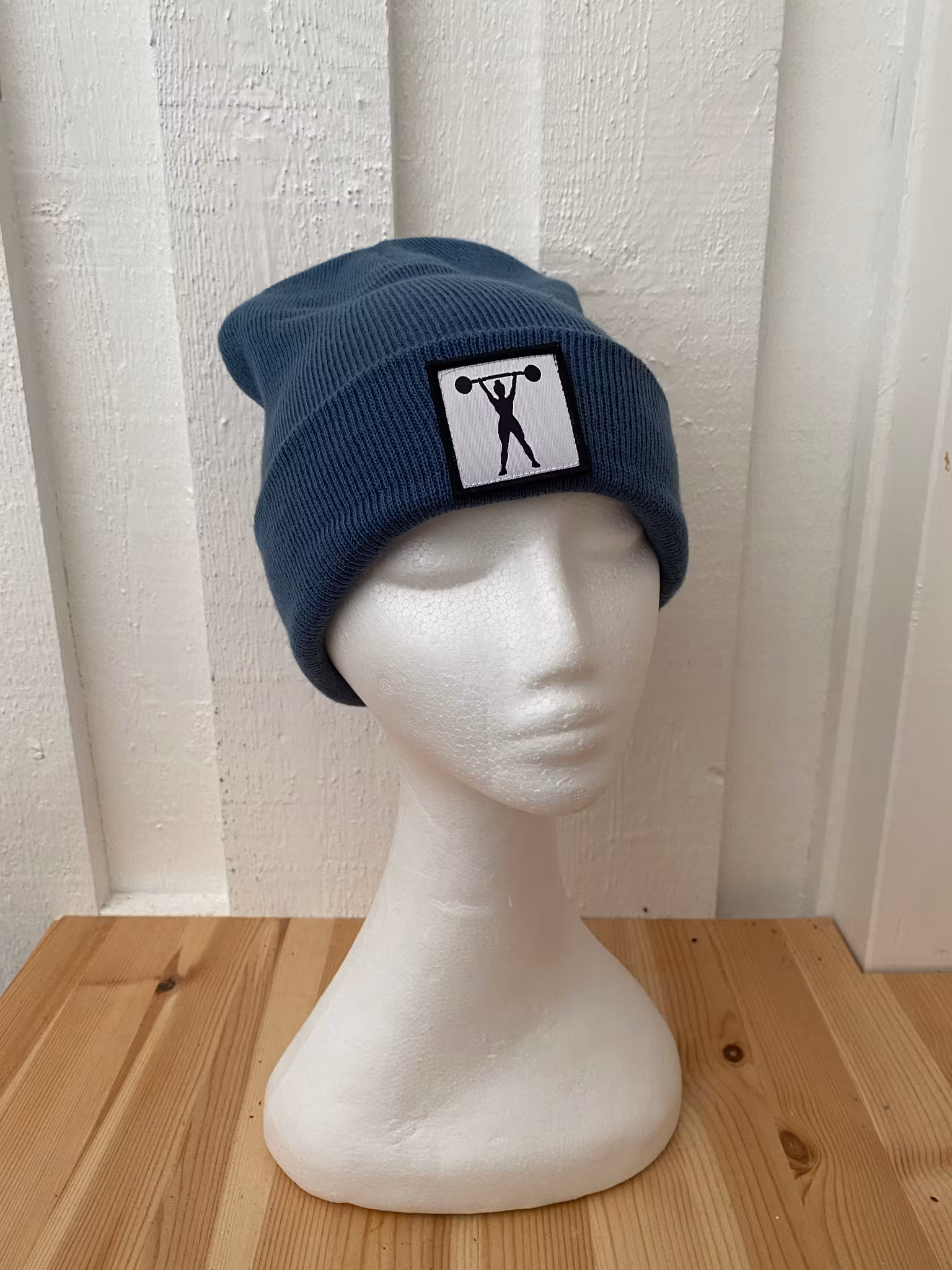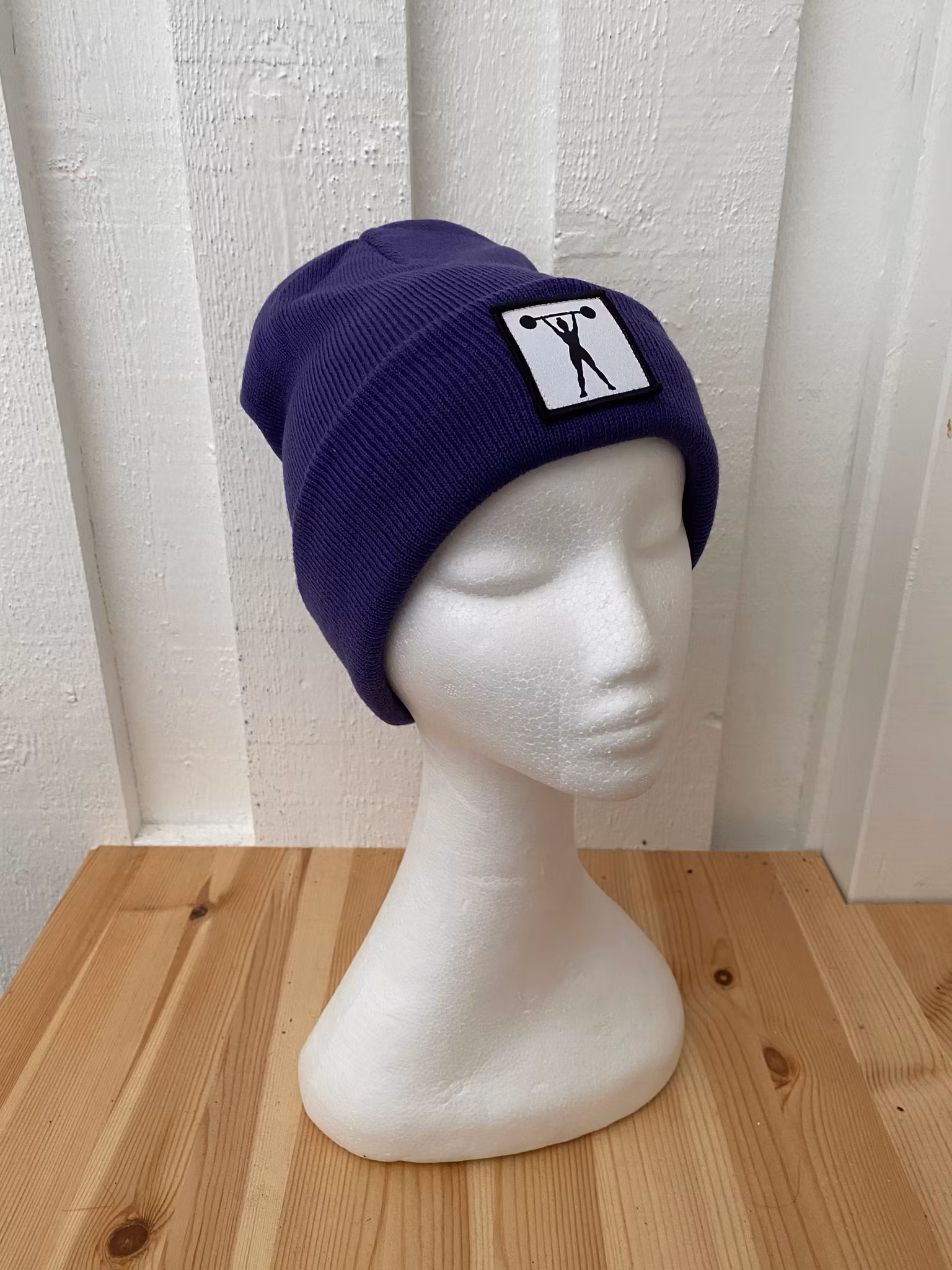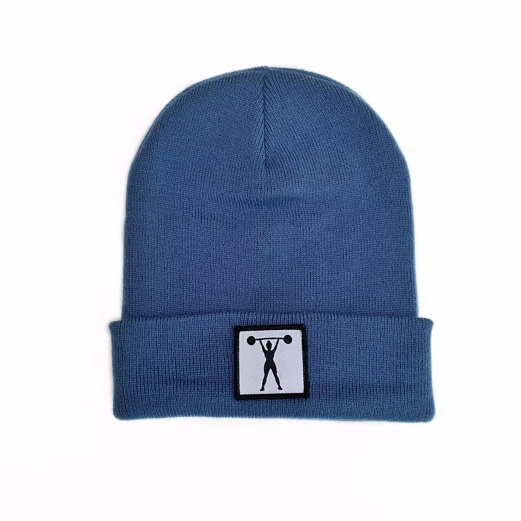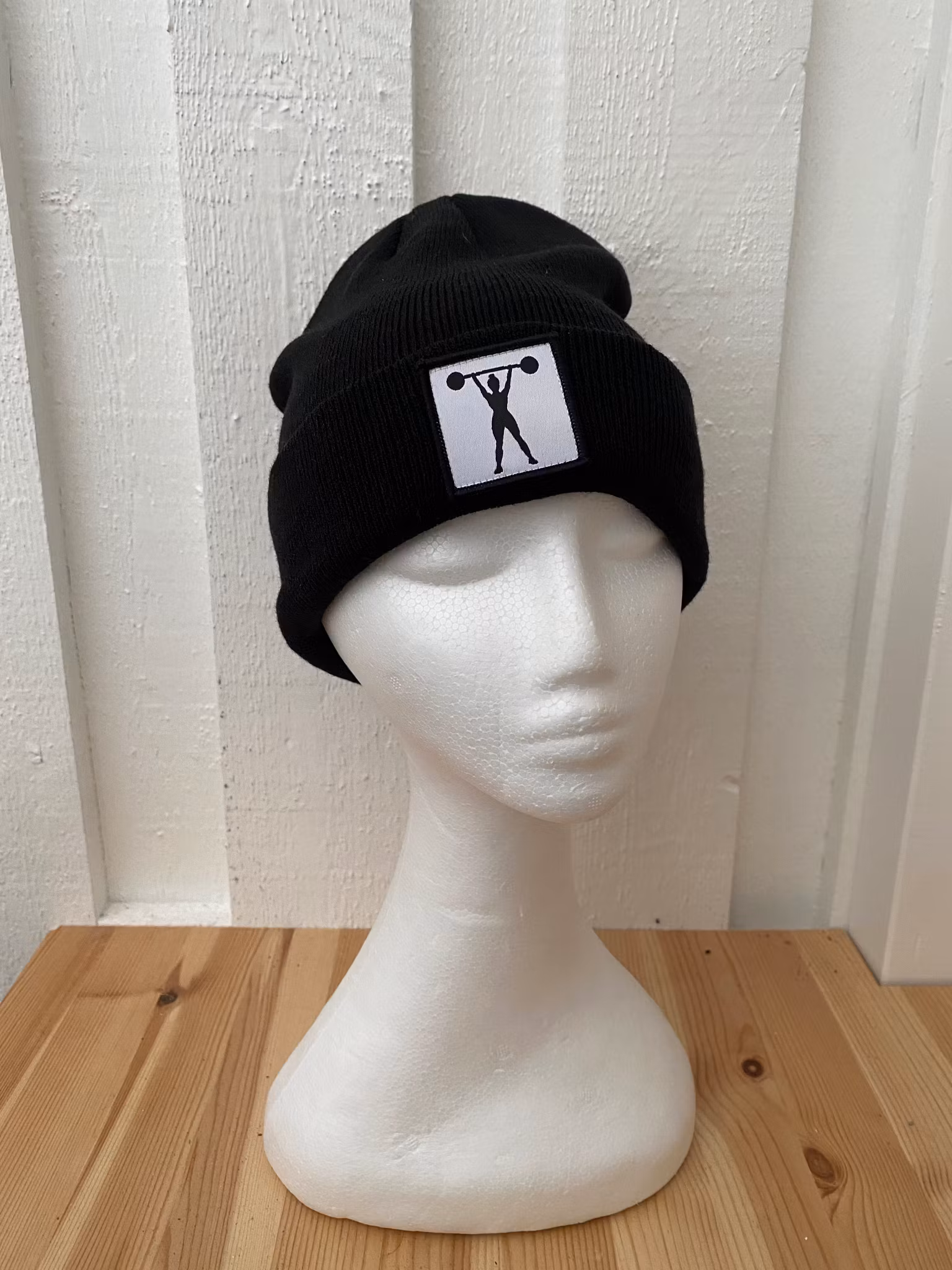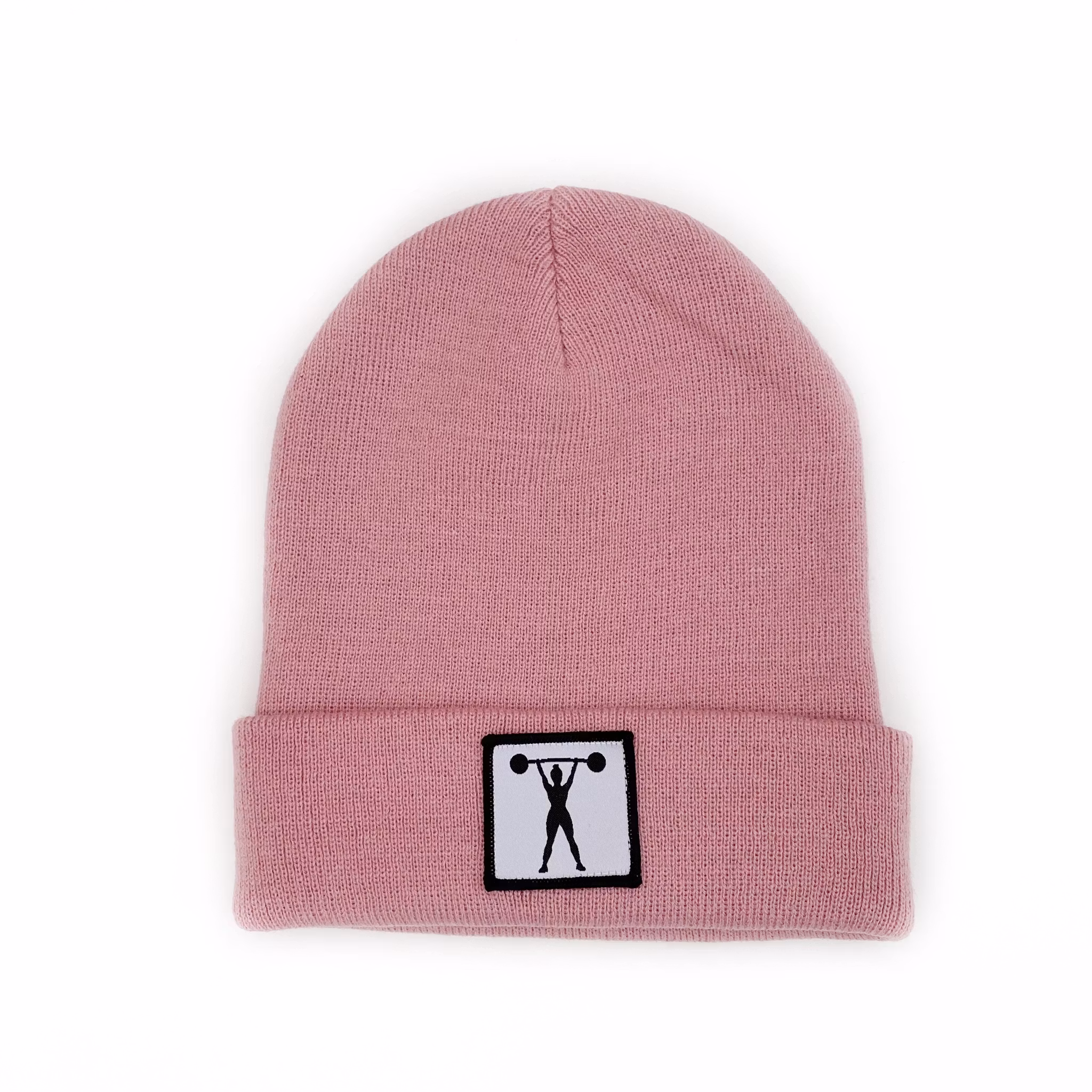 Stickad uppvikt beanie, påsytt märke med siluett av stark tjej med skivstång.
