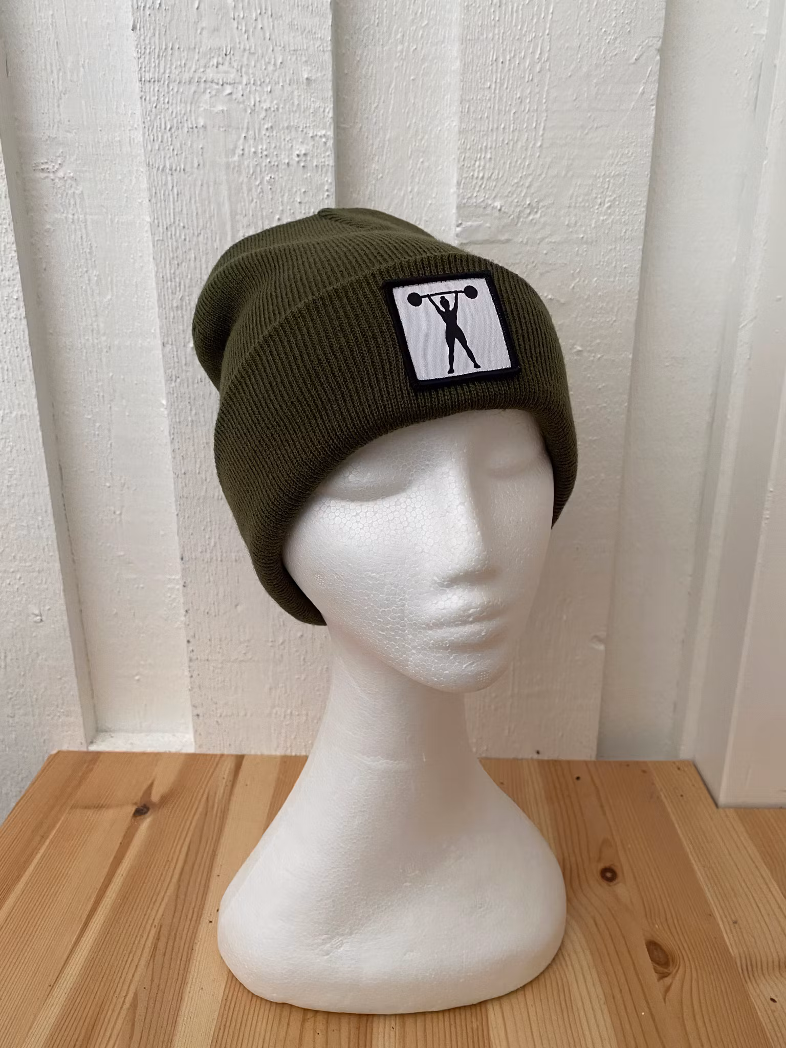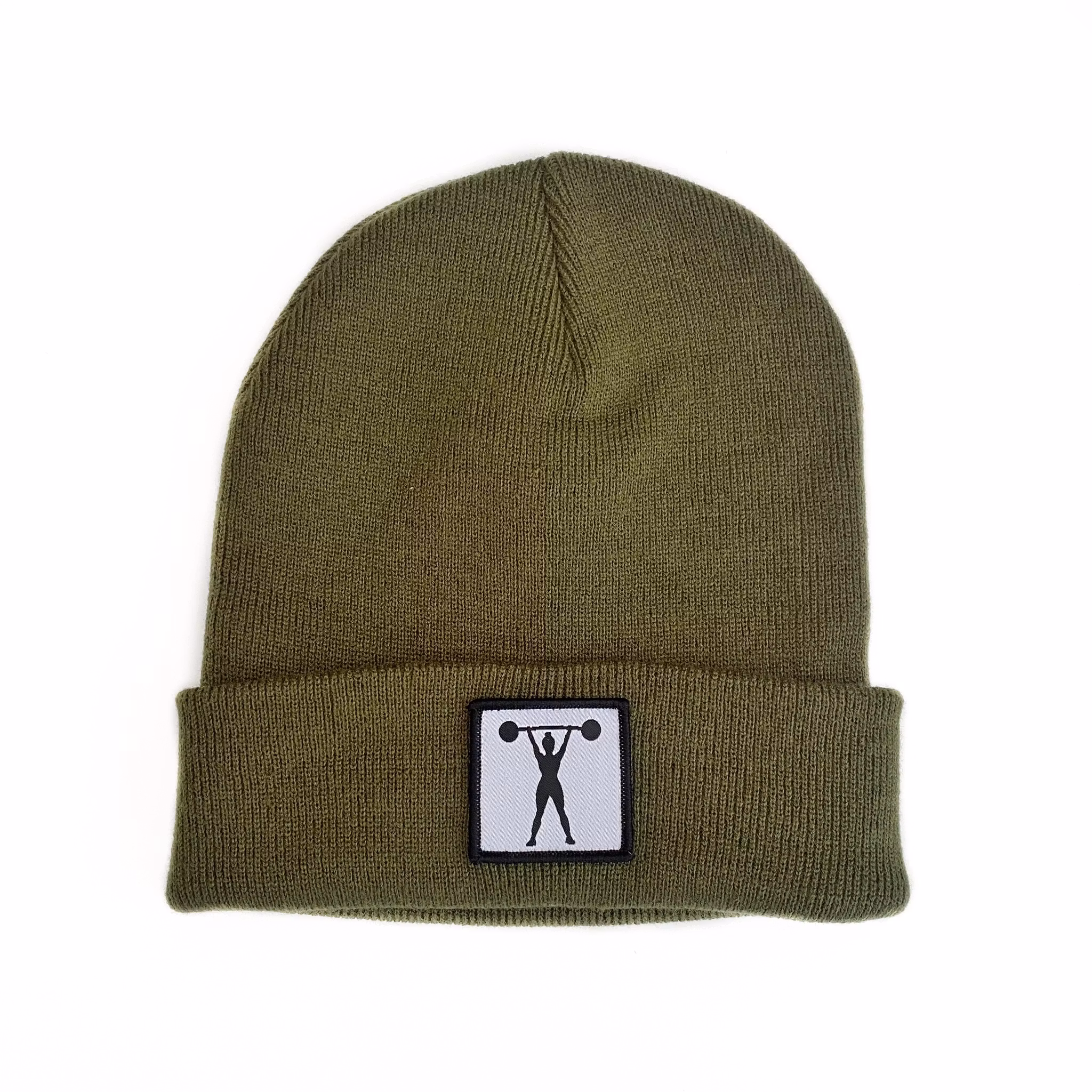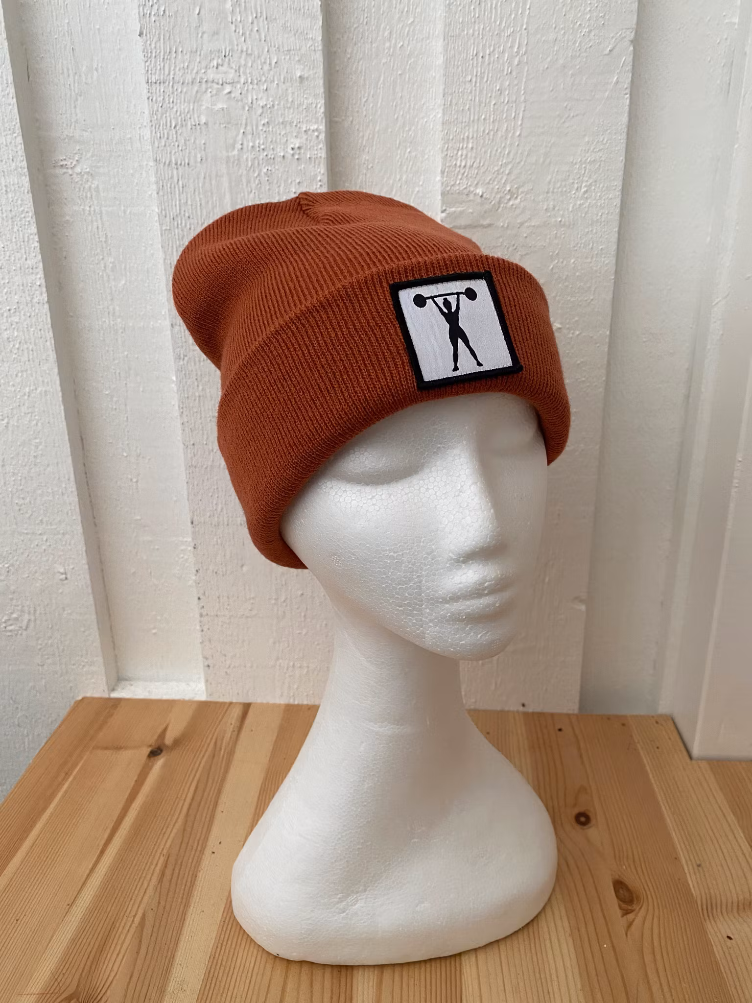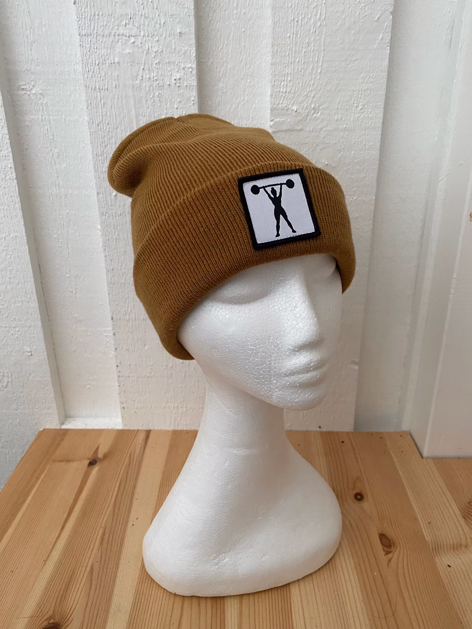 Stickad uppvikt beanie, påsytt märke med siluett av stark tjej med skivstång.