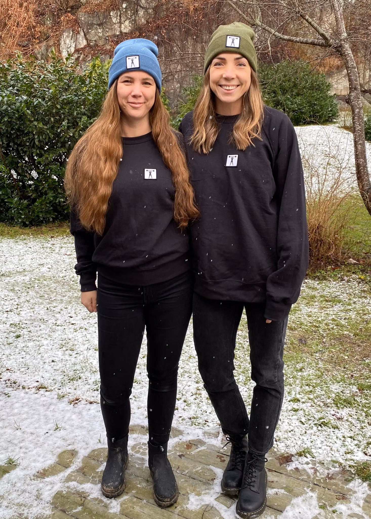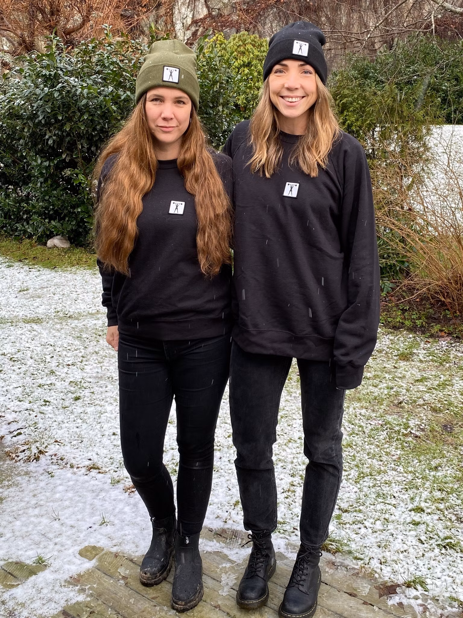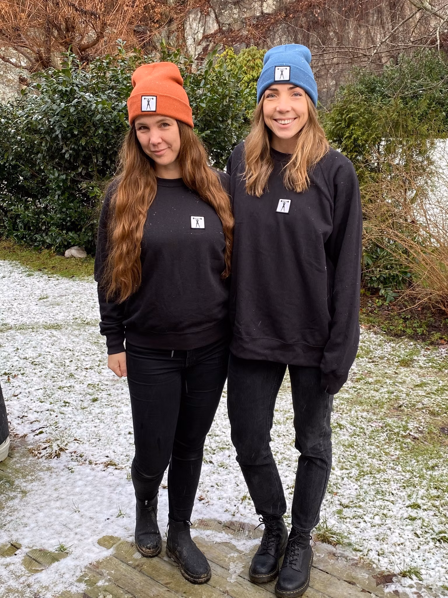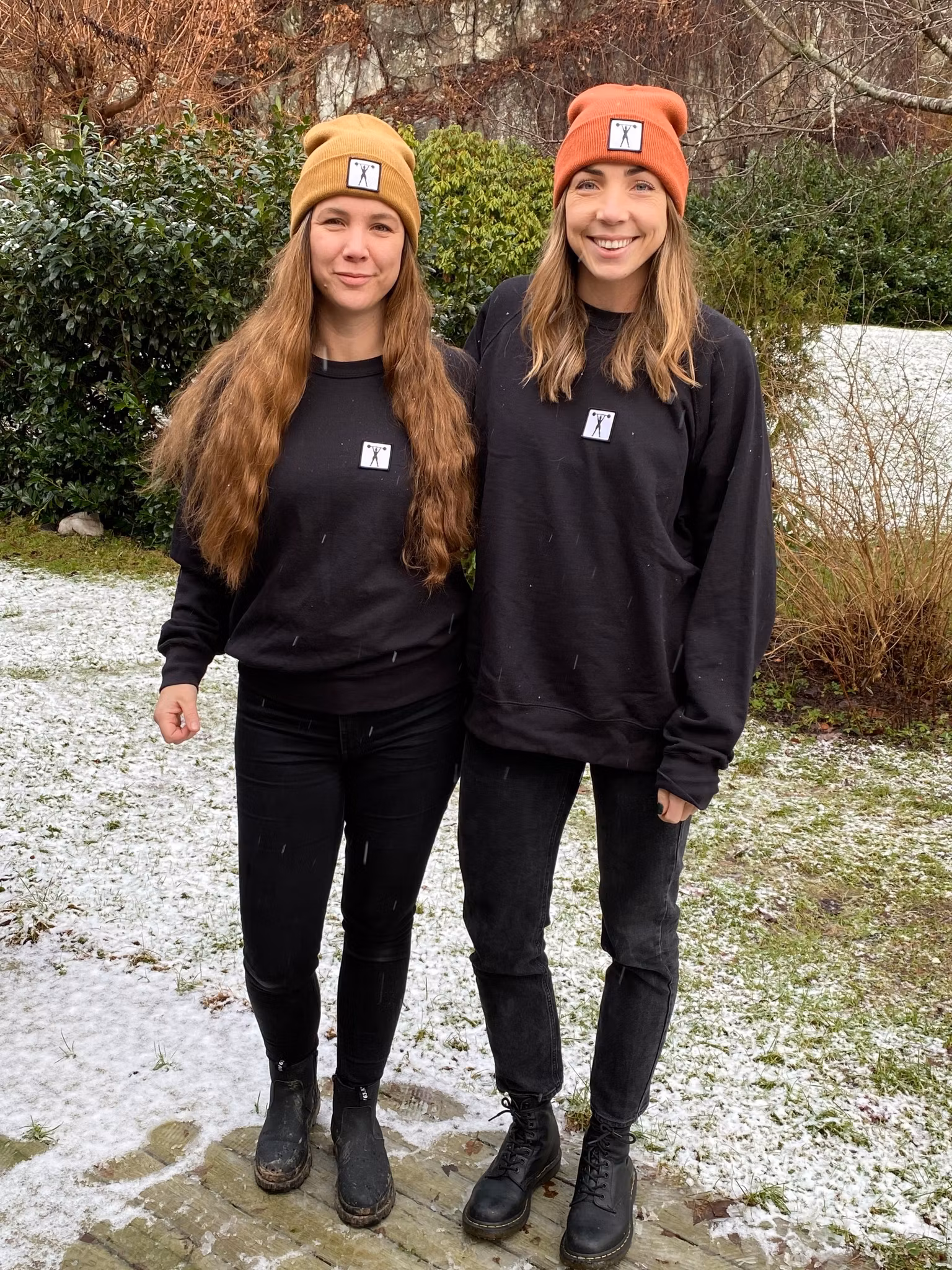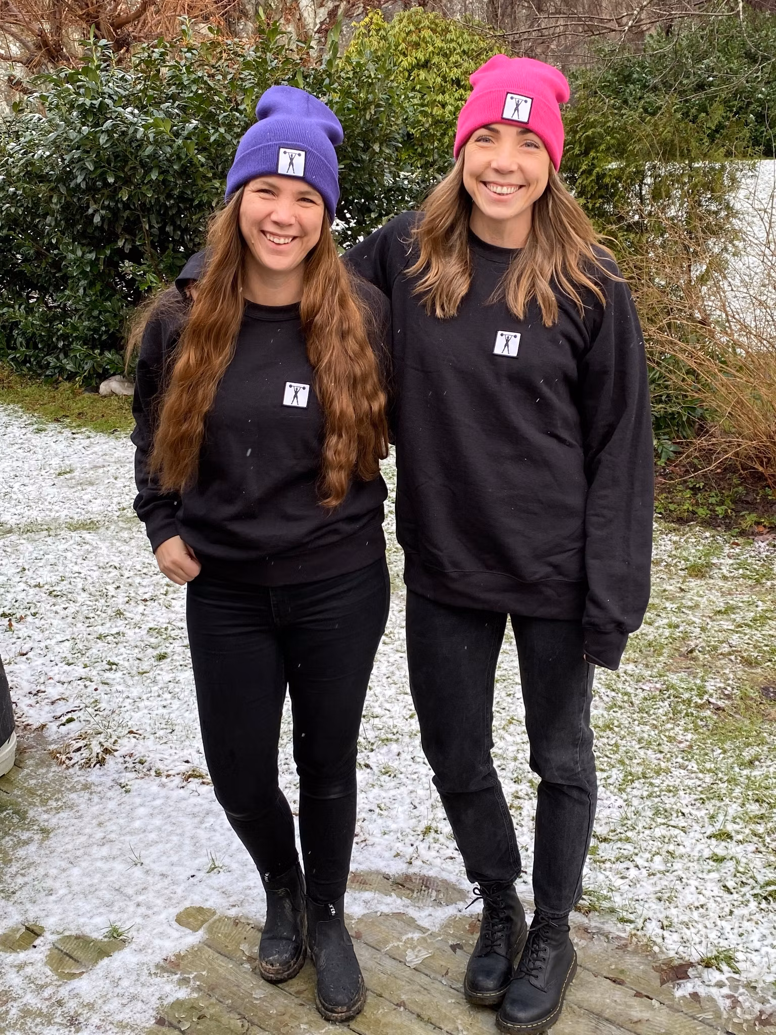 Stickad uppvikt beanie, påsytt märke med siluett av stark tjej med skivstång.